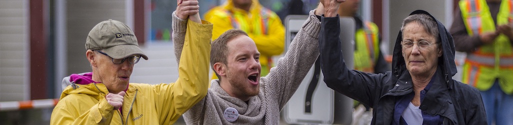 3 reactions ShareBig and exciting news! Earlier today (March 27) 13 defendants went into Boston’s West Roxbury District courthouse to answer charges related to their arrests as part of a sustained campaign to block construction on the West Roxbury Lateral Pipeline that included 198 arrests from October 2015 through September 2016. Although the prosecutor moved to reduce the charges from misdemeanor criminal offenses to civil infractions — the equivalent of a parking ticket, Judge Mary Ann Driscoll allowed each defendant testify briefly on the necessity of their actions.